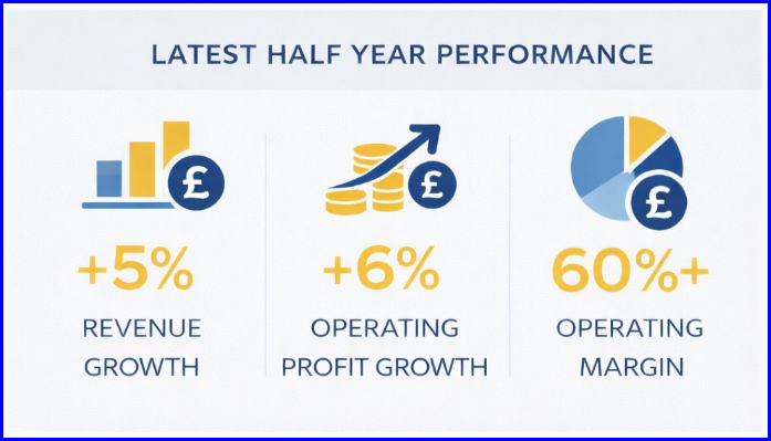 That position translates directly into financial firepower. In the most recent half year, revenue rose 5% to £318m, operating profit increased 6% to £200m, and operating margins remained north of 60%. These are not the economics of a fragile business. They are the economics of a platform with pricing power, minimal capital intensity, and deep customer dependency.