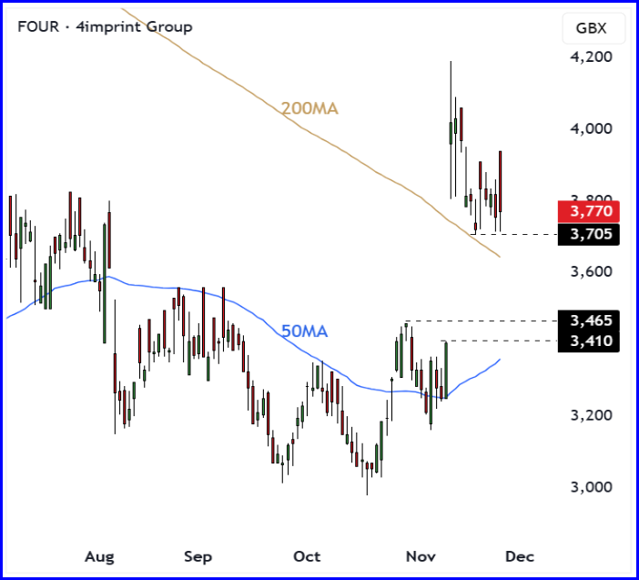 The shares gapped higher on the announcement and have been consolidating above the 200 day moving average ever since. That behaviour often marks the early stages of sentiment turning, and when you combine this with an upgrade to full year guidance, the conditions for a second tranche are now in place. FOUR has navigated a tricky year with a level of resilience that the market had not priced in, which gives us a timely opportunity to act.