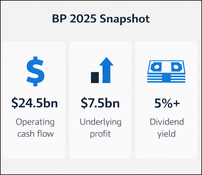 2. Strong cash generation: BP generated $24.5bn of operating cash flow in 2025 despite a softer oil price environment.