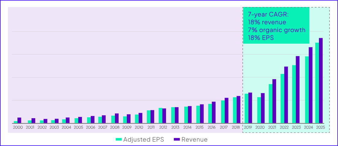 For the year ended September 2025, revenue reached £1.525bn, up from £1.363bn the year before. Operating profit increased to £276m, and net profit rose to £185m. Normalised earnings per share were 153p, compared with 127p the year before, a gain of just over 20%. Over the last five years, revenue has compounded at just over 23% per year, while normalised EPS has grown at roughly 26% per year. That is not cyclical noise. That is a business that has consistently found ways to grow both organically and through acquisitions.
