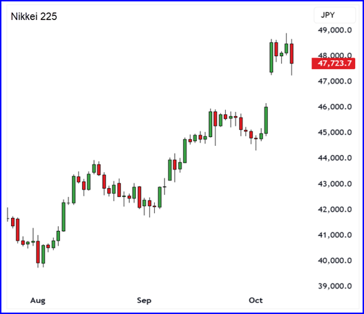 This week the “Takaichi Trade” has dominated global markets. The Japanese yen tumbled and Tokyo equities roared higher after Sanae Takaichi won the Liberal Democratic Party leadership race, putting her on track to become Japan’s first female prime minister later this month. Markets quickly moved to price in her reflationary agenda, betting that her government will favour large-scale fiscal stimulus and continued pressure on the Bank of Japan to maintain ultra-loose monetary policy. The result has been a surge in Japanese equities and one of the sharpest moves in USD/JPY in months.