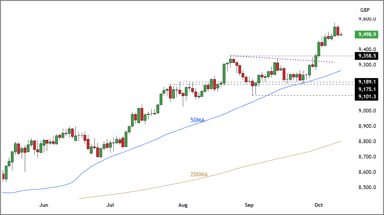 There are, however, small signs of short-term exhaustion creeping in. A two-bar reversal pattern has formed near the recent highs, suggesting the index may be due a brief pause or pullback before the next leg higher. For now, the focus remains on how buyers respond if price dips back towards the 9,350–9,400 area which is a zone that should now act as support in this ongoing trend.