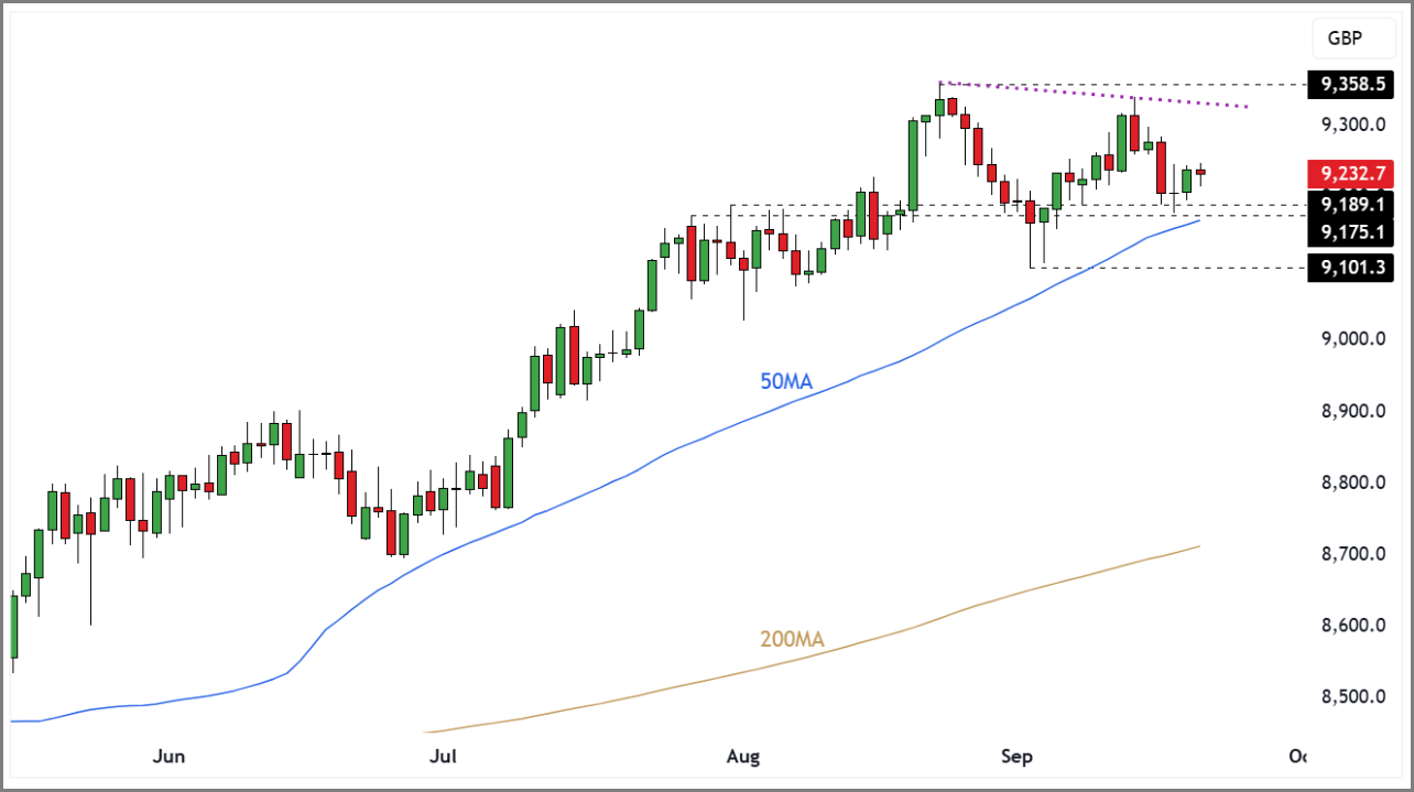 Having failed to retest its August highs, the FTSE has drifted lower this week and confirmed a new lower swing high. This shift is significant as it suggests the uptrend has now rolled into a consolidation phase rather than continuing in a straight line.