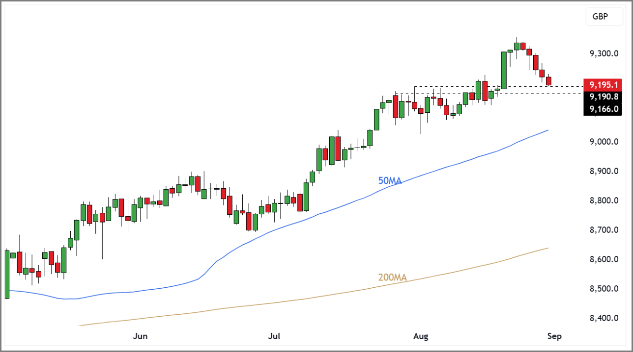 The FTSE’s breakout fizzled this week as the index gave back more than half of its recent gains. The pullback has been controlled, bringing prices back to the top of the old range where broken resistance will now be tested as support.