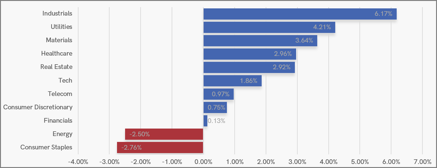 Industrials topped the table this week, boosted by strong moves in defence stocks following Donald Trump’s military action in Venezuela. Utilities also performed well, potentially helped by Storm Goretti in the UK, which has brought renewed focus on domestic infrastructure and grid resilience. Materials, Healthcare and Real Estate added to the upside, giving the rally some breadth.